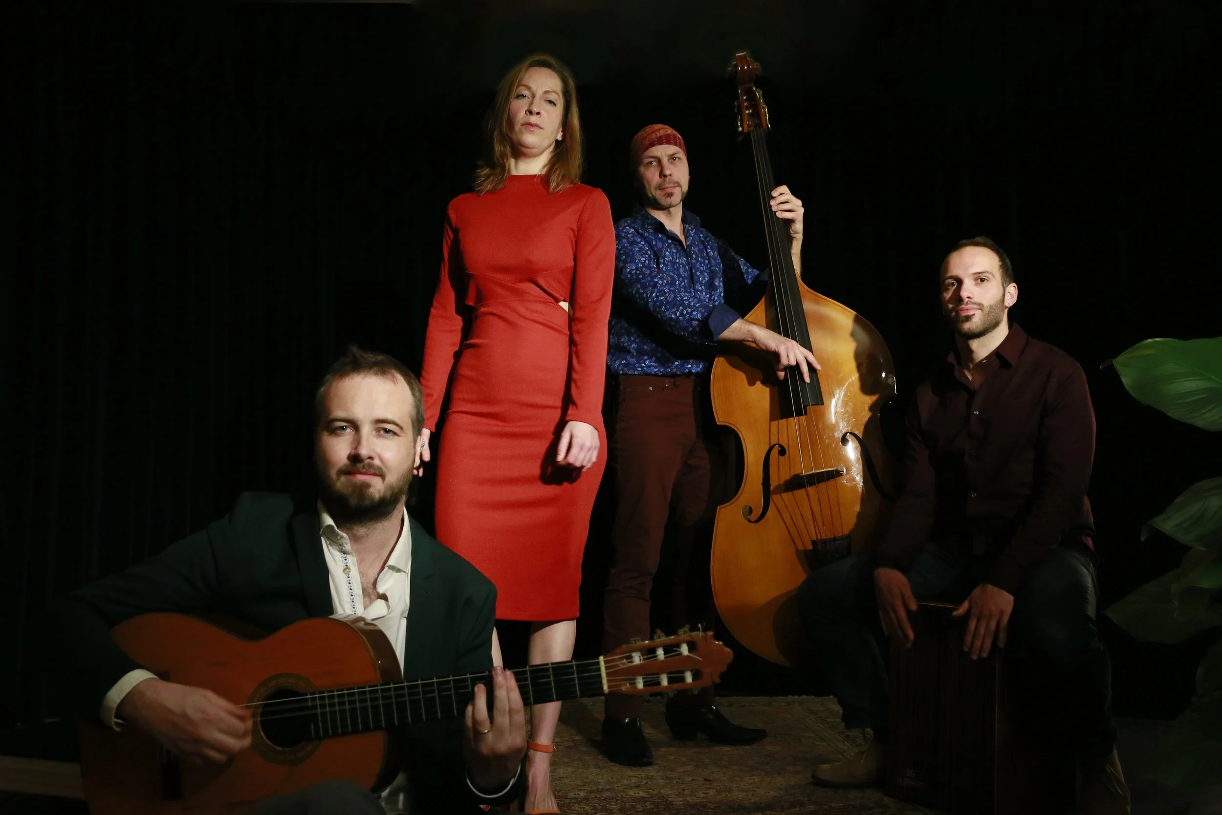 A warm guitar, sweet voice, and deep double bass, and for an even more festive effect, vivacious percussion.